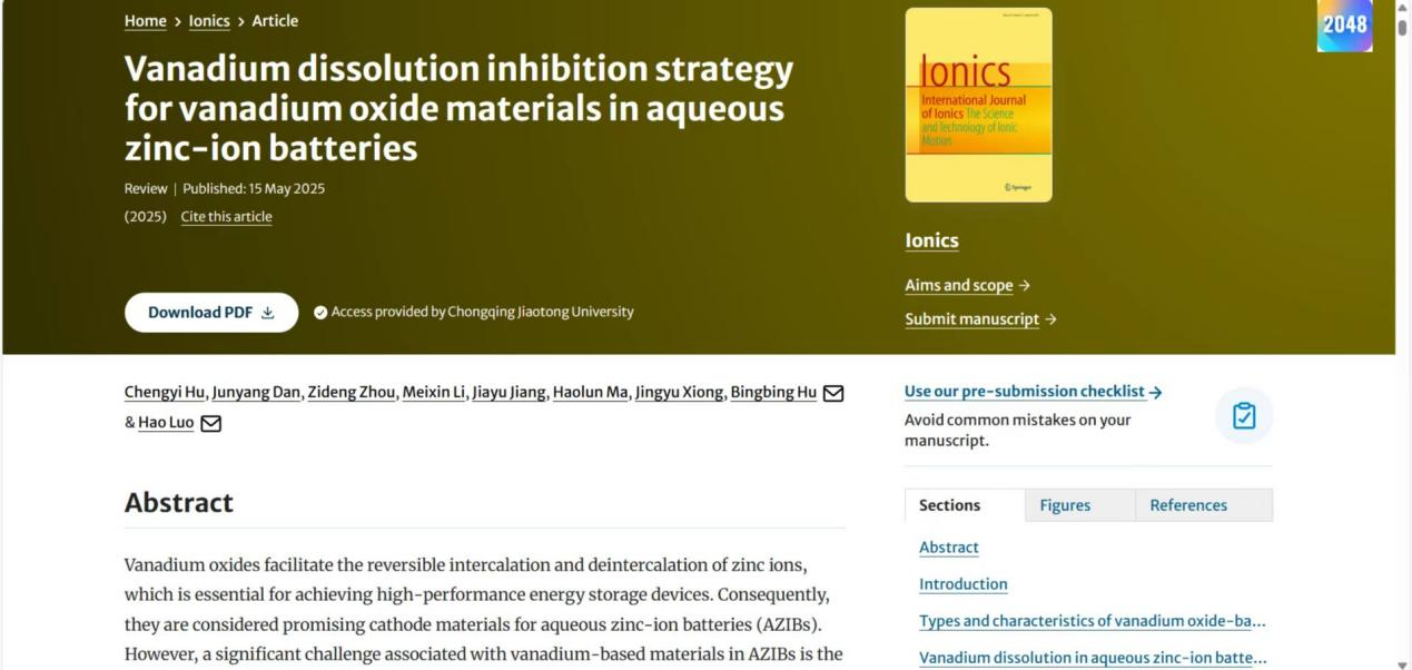 近日,伟德国际victor·1946源自材料科学与工程专业本科生胡成毅同学以独立第一作者身份在中科院SCI四区期刊Ionics第32卷上在线发表题为“Vanadium dissolution inhibition strategy for vanadium oxide materials in aqueous zinc ion batteries”的综述性论文,该工作对目前水系锌离子电池中钒溶解的相关基础问题进行了深入全面的综述,提出了主流的抑制钒溶解策略以及新兴抑制策略的发展趋势。论文的指导老师为材料科学与工程学院、重庆市电源学会储能专委会办公室副主任胡兵兵副教授。