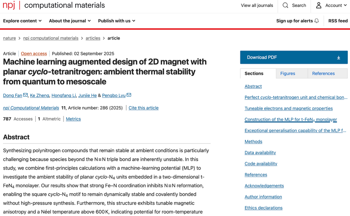 材料学院青年教师樊冬在国际顶级期刊Nature子刊npj Computational Materials上发表了题为“Machine learning augmented design of 2D magnet with planar cyclo-tetranitrogen: ambient thermal stability from quantum to mesoscale”的学术论文。伟德国际1946为论文第一通讯单位,学院2024级硕士研究生郑柯为第二作者,学院樊冬博士和湘潭大学吕蓬勃博士为论文共同通讯作者。