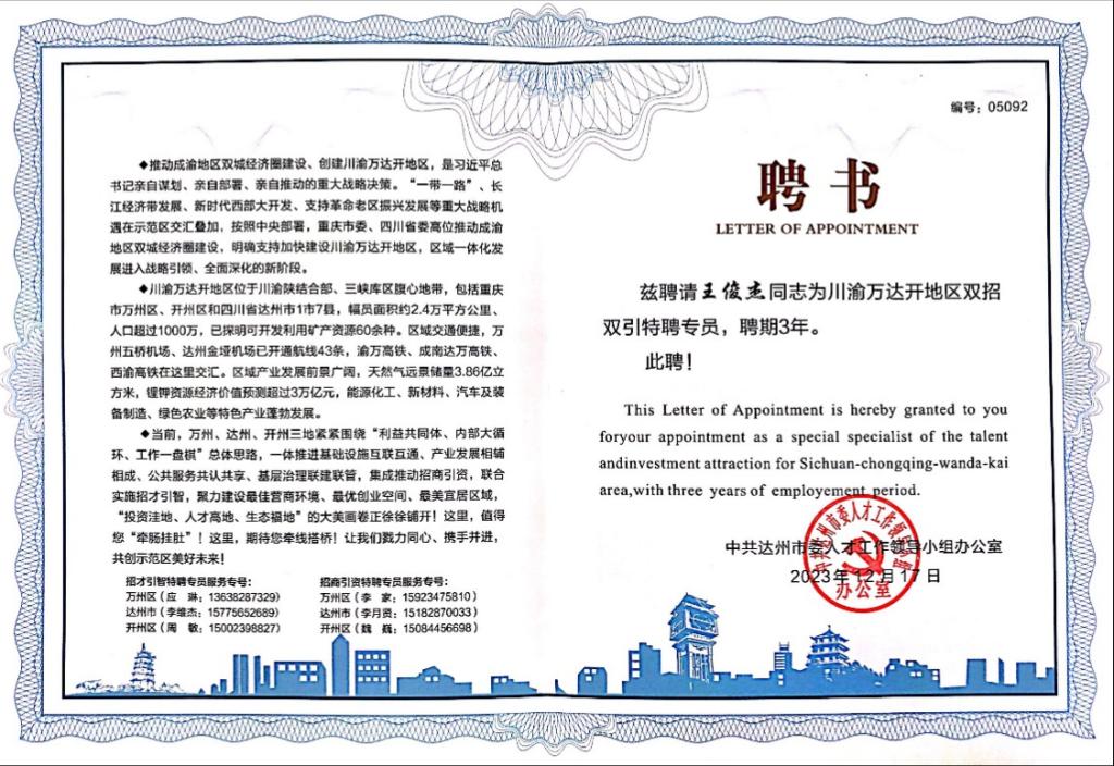 12月17日,在“成渝地区双城经济圈能源化工产业创新发展研讨会”,材料学院一行进一步了解了新材料、能源与化工等相关企业遇到的技术难题和需求。王俊杰被达州市聘请为“川渝万达开地区双招双引特聘专员”。