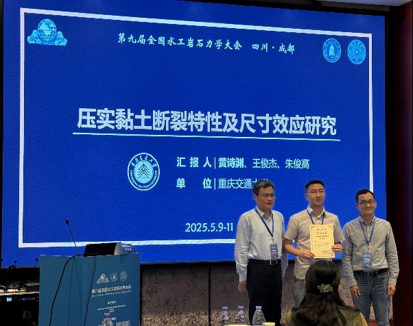 作为大会第六分会场“岩石力学新技术与新方法”的联合主持人,王俊杰院长与重庆大学杨海清教授共同主持了上半场学术报告,该分会场聚焦岩体力学新理论、新装备及智能化技术,特邀清华大学刘耀儒教授、中国水利水电科学研究院王玉杰教授等知名专家作特邀报告。黄诗渊副教授在第一分会场“重大水利水电工程岩石力学与结构安全”作了题为“压实黏土断裂特性及尺寸效应研究”的学术报告,报告聚焦高土石坝防渗心墙材料的裂缝扩展机制,系统探讨了压实黏土断裂特性的尺寸效应问题。