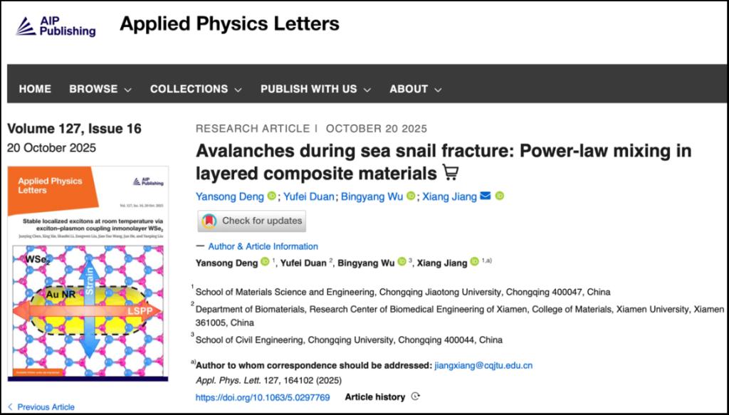 近日,我校伟德国际victor·1946源自蒋翔教授课题组在自然指数期刊、国际著名物理学期刊Applied Physics Letters上发表了题为“Avalanches during sea snail fracture: Power-law mixing in layered composite material”的层状复合材料破坏雪崩动力学研究成果。论文第一作者为伟德国际victor·1946源自2023级硕士研究生邓岩松,通讯作者为蒋翔教授。