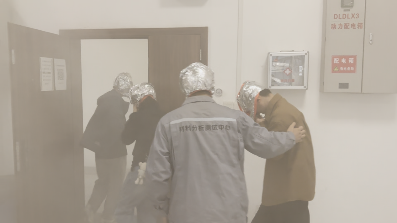 随后的应急演练环节在道路楼204-2高温实验室模拟展开。本次演练预设场景为“烘箱因长时间运行、内部存放物品过热引发自燃”。火情模拟信号发出后,参训师生立即启动应急响应机制,现场人员迅速切断设备电源,并第一时间向实验室安全负责人及学院报告火情;与此同时,所有人员在疏散引导员的指挥下,低姿、捂鼻、沿墙壁一侧的疏散指示标志,快速、有序地撤离至室外指定安全区域集结。整个演练过程指令清晰、行动迅速、配合默契,全员安全疏散,达到了预期效果。