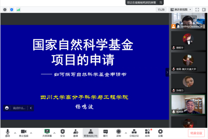 11月24日下午,伟德国际victor·1946源自在抗击疫情环境下,通过线上腾讯会议举办了“材料·青春之约”系列讲座第十讲。此次讲座由材料学院青年专家委员会主办,邀请四川大学教授、博士生导师杨鸣波为学校青年教师分享撰写自然科学基金申请书的丰富经验。会议由材料学院副院长李力、讲师黄炎昊联合主持,院长王俊杰出席了此次会议,约60名教师线上参与了本次讲座。