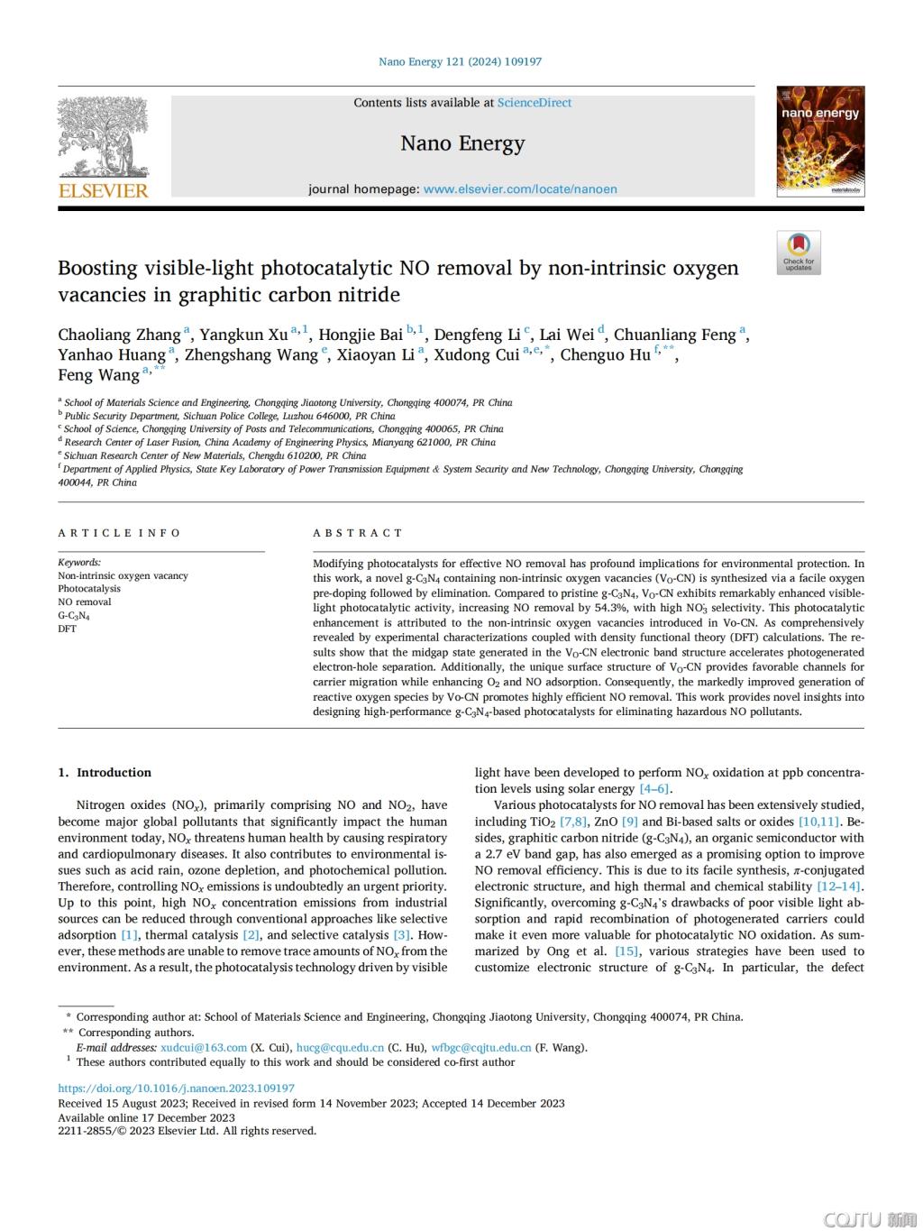 伟德国际victor·1946源自王锋教授团队在能源新材料领域取得重要研究进展,相关成果“Boosting visible-light photocatalytic NO removal by non-intrinsic oxygen vacancies in graphitic carbon nitride”在《Nano Energy》发表(https://doi.org/10.1016/j.nanoen.2023.109197)。论文第一作者为伟德国际victor·1946源自研究生张朝良、许杨坤,通讯作者为王锋教授与崔旭东研究员。