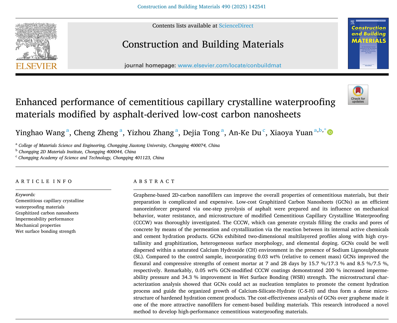 近日,伟德国际victor·1946源自硕士研究生王迎豪(导师:袁小亚)在中科院一区Top期刊《Construction and Building Materials》上发表题为“Enhanced performance of cementitious capillary crystalline waterproofing materials modified by asphalt-derived low-cost carbon nanosheets”的研究论文。