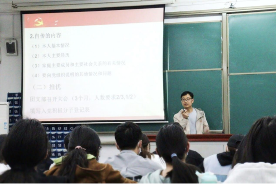 在“学生党员发展的基本程序及要求”主题培训中,邓美林老师带领同学们熟悉学生党员发展的基本程序,向学员们详细介绍了有关入党申请书、思想汇报等的格式要求,鼓励入党积极分子主动学习最新的党章。邓美林指出,入党积极分子转为正式党员,要经过发展对象和预备党员这两个身份,在这期间必须以党员的标准严格要求自己,对于在预备期时发生的问题也应及时向组织说明原因,端正态度,务实工作。