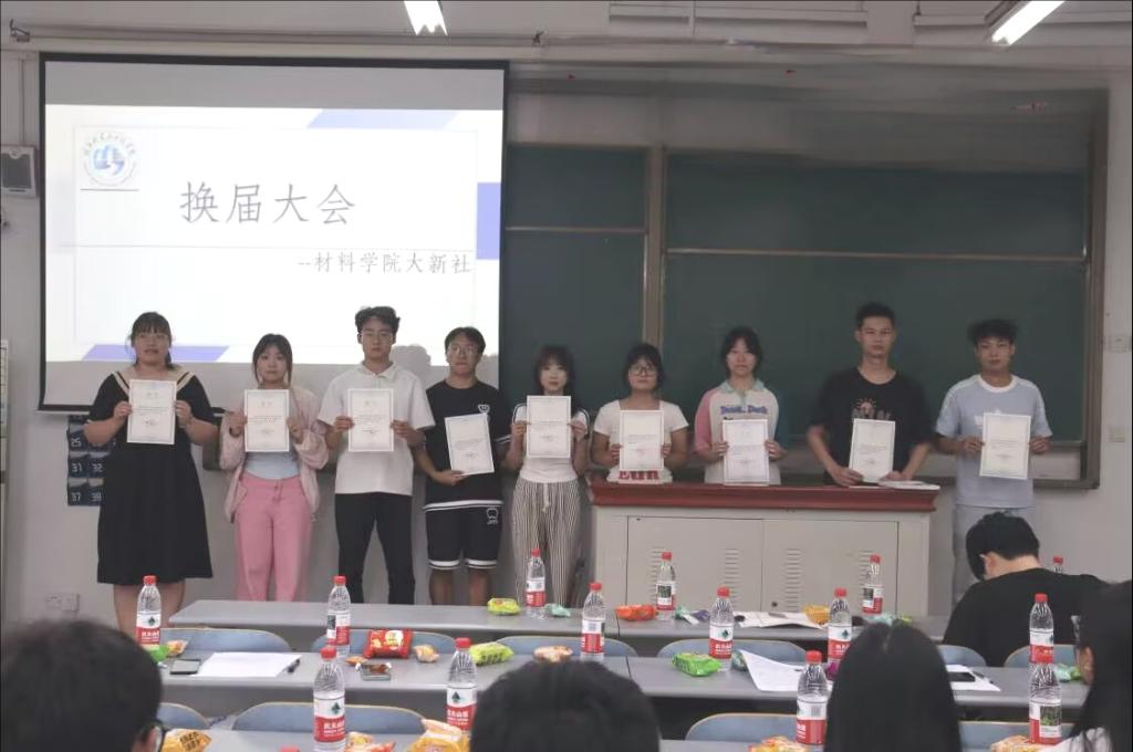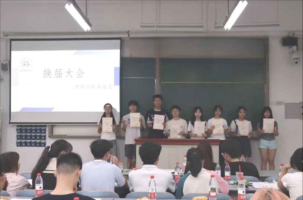 大会伊始,现场气氛热烈非凡。首先进行的是社长和干部干事聘书发放环节。在全体成员的注视下,上一届社长为现任社长、干部及干事们颁发聘书。一份份聘书,不仅是对他们过往努力与付出的认可,更是一份沉甸甸的责任与期待。接过聘书的成员们,脸上洋溢着自豪与坚定,随后大家共同合影留念,用镜头定格这一光荣瞬间,记录下属于大新社的荣耀时刻。